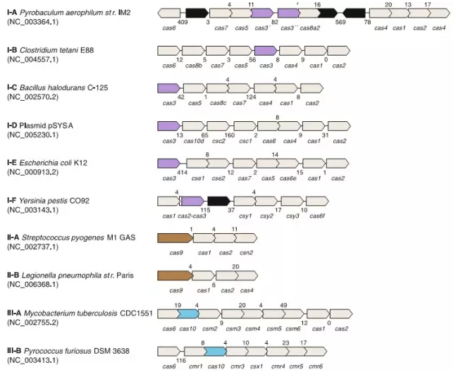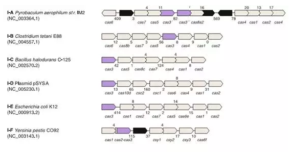 I 型CRISPR的標(biāo)簽基因是Cas3(紫色)。在不同的物種中,又將I 型細分為6個亞型(I-A-E),圖3。