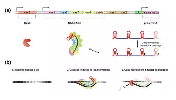 在表達階段(圖4. a),I 型會產(chǎn)生三個部分:Cas3,Cascade(Cse1, Cse2,Cas7, Cas5和Cas6e的復(fù)合物)和pre-crRNA。Pre-crRNA通過Cascade中的Cas6e來剪切加工獲得成熟的crRNA,并和Cascade繼續(xù)形成復(fù)合物狀態(tài)。