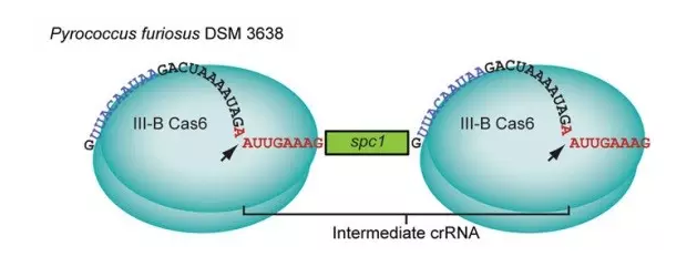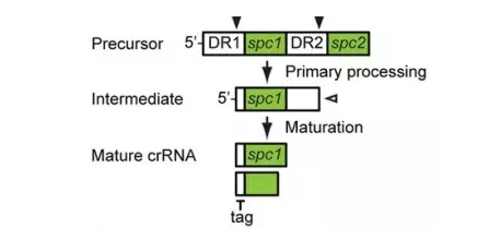 圖9. PrecrRNA經(jīng)過初始加工后,分別形成獨立中間狀態(tài)的crRNA,之后經(jīng)過3‘端核酸酶的剪切,形成成熟的crRNA。