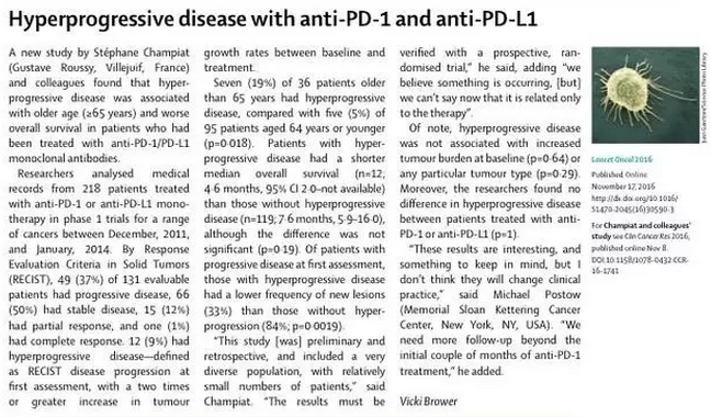 Champiat在接受采訪時(shí)說:“這只是初步回顧性研究數(shù)據(jù)、而且研究群體多樣復(fù)雜,標(biāo)本數(shù)量小”,“所以,對資料數(shù)據(jù)解讀應(yīng)與前瞻隨機(jī)設(shè)計(jì)的實(shí)驗(yàn)資料對比解讀判斷。而且,我們目前雖然不能說這種超進(jìn)展情況與治療直接有關(guān),但相信某種情況確實(shí)是在發(fā)生著”。