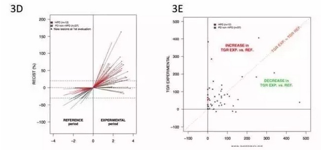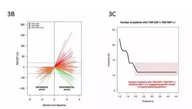 為了識(shí)別出癌癥疾病進(jìn)展了的群體,研究人員計(jì)算了滿足以下條件的患者數(shù):治療后的TGR> 治療前TGR x t,其中t是整數(shù)閾值(從1到5)。t為2,3,4,5的就是疾病高度進(jìn)展了的患者(HPD)。