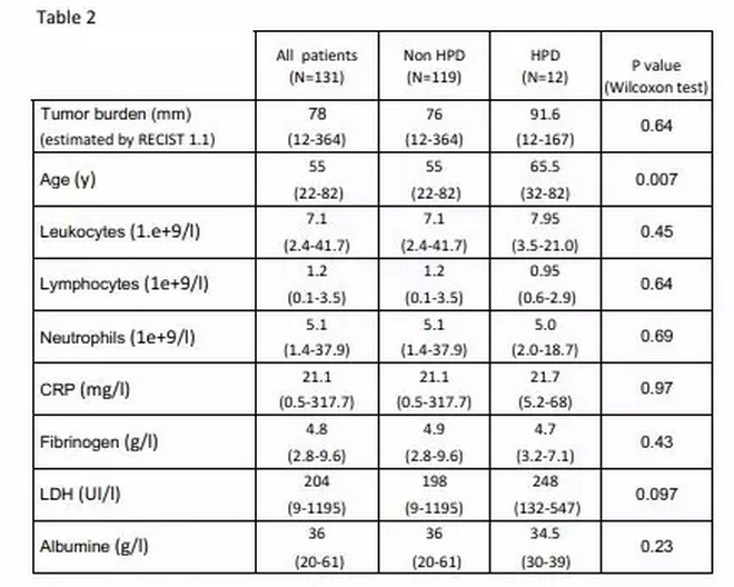 我們觀察到HPD相比非HPD患者年齡更高,這是非常值得重視的。這可能是老年患者與年輕患者有著不同的免疫學(xué)背景的原因,比如T細(xì)胞共刺激/共抑制蛋白表達(dá),以及更高的炎癥細(xì)胞因子的濃度。同時(shí),這與之前三個(gè)獨(dú)立報(bào)道的三期臨床實(shí)驗(yàn)中老年人從藥物中受益較少的結(jié)果是一致的,這其中的機(jī)制非常值得研究。