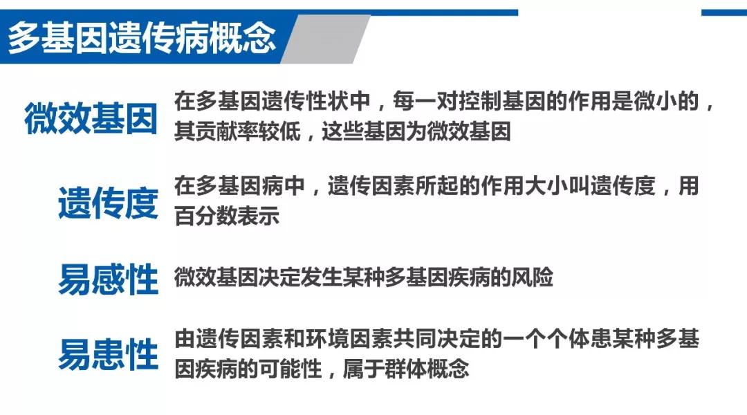 多基因遺傳病,指遺傳信息通過兩對及兩對以上致病基因的累積效應所致的遺傳病,其遺傳效應較多地受環(huán)境因素的影響,其又被稱為復雜疾病。有關多基因遺傳病的幾個關鍵概念如下: