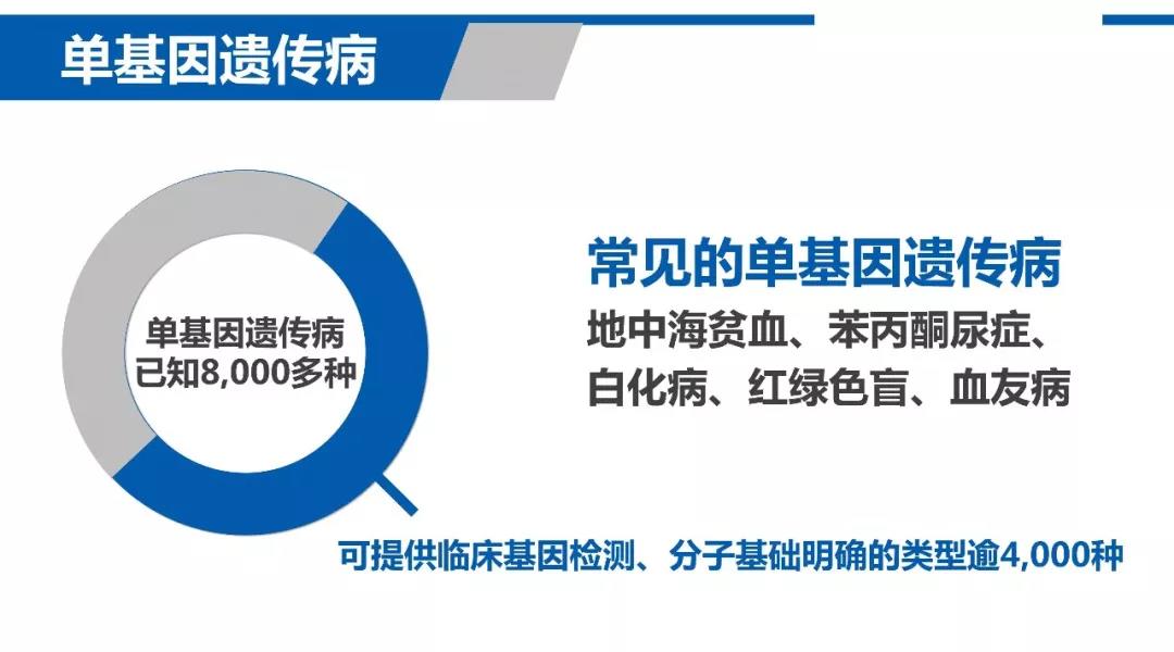 單基因遺傳病 (以下簡稱“單病”),由單個基因突變引起,突變基因可發(fā)生在常染色體或性染色體上,呈顯性或隱性。單病通常呈現(xiàn)特征性的家系傳遞模式。常見的單病有地中海貧血、白化病、苯丙酮尿癥、紅綠色盲、血友病等。這類疾病的發(fā)生由等位基因所控制,多數(shù)無法治愈,有個別疾病可以通過后天干預根治。所以,預防勝于治療,做好孕前基因篩查是預防單病的有效手段。