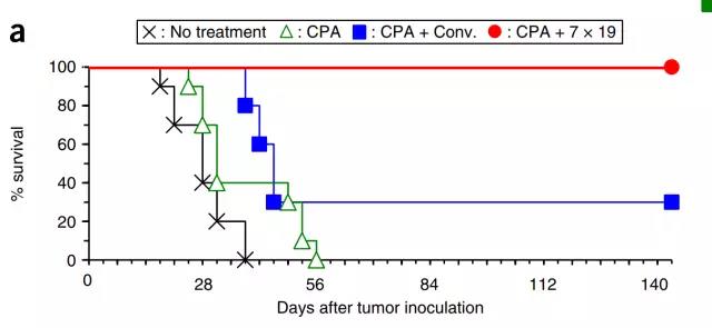 首先是肥大細(xì)胞瘤小鼠模型。接受適量環(huán)磷酰胺預(yù)處理后的肥大細(xì)胞瘤小鼠分別接受常規(guī)CAR-T或新一代CAR-T治療。結(jié)果Tamada教授發(fā)現(xiàn),常規(guī)CAR-T只能稍微改善肥大細(xì)胞瘤小鼠的生存,而新一代CAR-T可以使所有實驗小鼠的腫瘤完全消除,同時在140天的觀察期內(nèi)沒有復(fù)發(fā)。