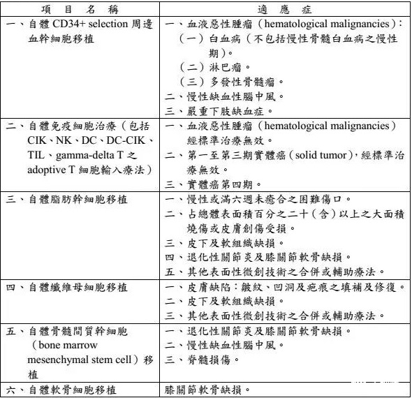 6項細(xì)胞治療項目分別為,自體周邊血干細(xì)胞移植、自體免疫細(xì)胞治療(包括CIK、NK、DC、DC-CIK、TIL、gamma-delta T之adaptive T細(xì)胞輸入療法)、自體脂肪干細(xì)胞移植、自體纖維母細(xì)胞移植、自體間充質(zhì)干細(xì)胞移植、自體軟骨細(xì)胞移植術(shù)。