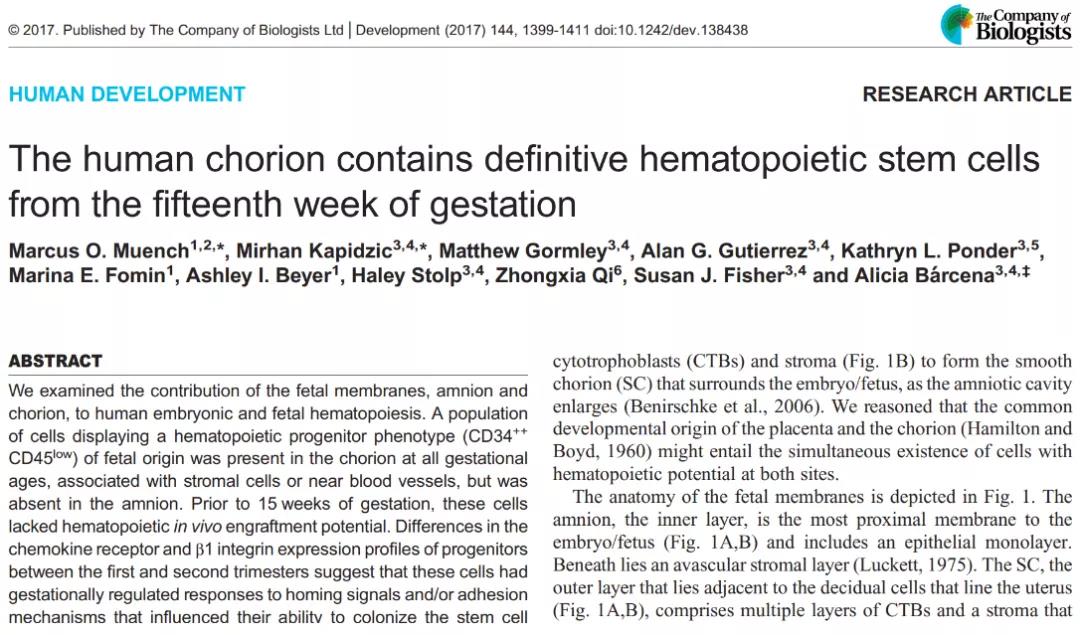 2017:從妊娠第15周開始胎盤絨毛膜就含有造血干細胞