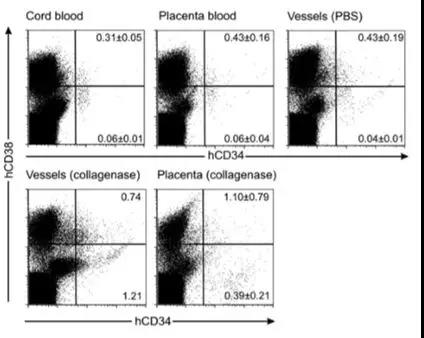 運用流式細胞計數技術檢測臍血、胎盤血、血管、胎盤(膠原酶處理后)中造血干細胞(CD34+CD38-細胞)以及造血祖細胞(CD34+CD38+細胞)的含量。胎盤中含有1.1±0.79%的造血祖細胞,含有0.39±0.21%的造血干細胞。與之相比,臍帶血含有0.31±0.05%的造血祖細胞和0.06±0.01%的造血干細胞。胎盤血中含有0.43±0.16%的造血祖細胞和0.06±0.04%的造血干細胞?!猂obin C et al. Human placenta is a potent hematopoietic niche containing hematopoietic stem and progenitor cells throughout development. Cell stem cell.2009 2;5(4): 385-95.