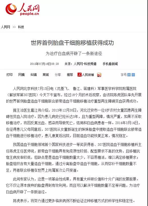 2015年7月16日,解放軍第307醫(yī)院陳虎教授團隊宣布,經過16個月的術后觀察,世界首例胎盤造血干細胞移植治療重型再生障礙貧血獲得成功。