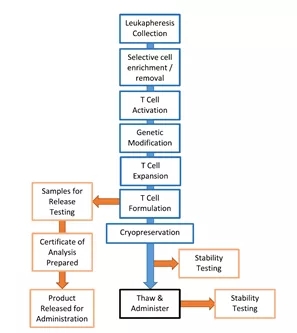 自體回輸的CAR-T制備工藝經過:T細胞采集及儲存-T細胞的富集-T細胞激活-T細胞轉導修飾-T細胞擴增-成品CAR-T儲存等。質量控制和檢測環(huán)節(jié)貫穿整條工藝線。在整個工藝流程中,有幾個關鍵環(huán)節(jié)和關鍵指標需要注意。以下分析的基礎為已上市的兩款CAR-T產品和中國食品藥品檢定研究院發(fā)布的CAR-T的生產考慮要點。