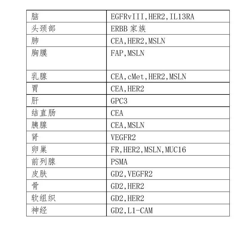 不像血液瘤中CD19表達于所有B細胞表面,實體瘤的抗體選擇更為復雜。常見的實體瘤靶點有HER2,CEA,EGFR,GD2,PSMA,Mesothelin,MUC1等都是腫瘤相關性靶點,在腫瘤中高表達,在正常組織中也有少量的表達。比如HER2靶點廣泛出現在乳腺癌中,但是在正常的心肺組織中,也有少量表達。曾有有患者接受了靶向HER2的CAR-T治療,在5天之后,因為CAR-T誘導的心肺功能衰竭而死亡。實體瘤靶點有EGFR/EGFRvIII,HER2,CEA,MSLN,FAP,cMet,GPC3,GD2,MUC1,L1-CAM等。