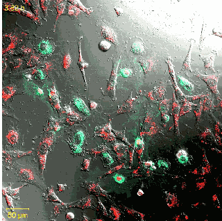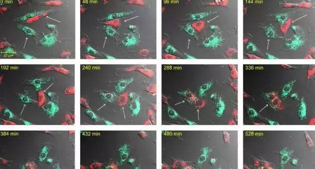 活細(xì)胞染為紅色,死亡的心肌細(xì)胞染為青色,間充質(zhì)干細(xì)胞不斷遷移,箭頭所指部位間充質(zhì)干細(xì)胞逐漸與死亡細(xì)胞融合成為雙核,400分鐘時死亡的心肌細(xì)胞開始奇跡般地復(fù)活。