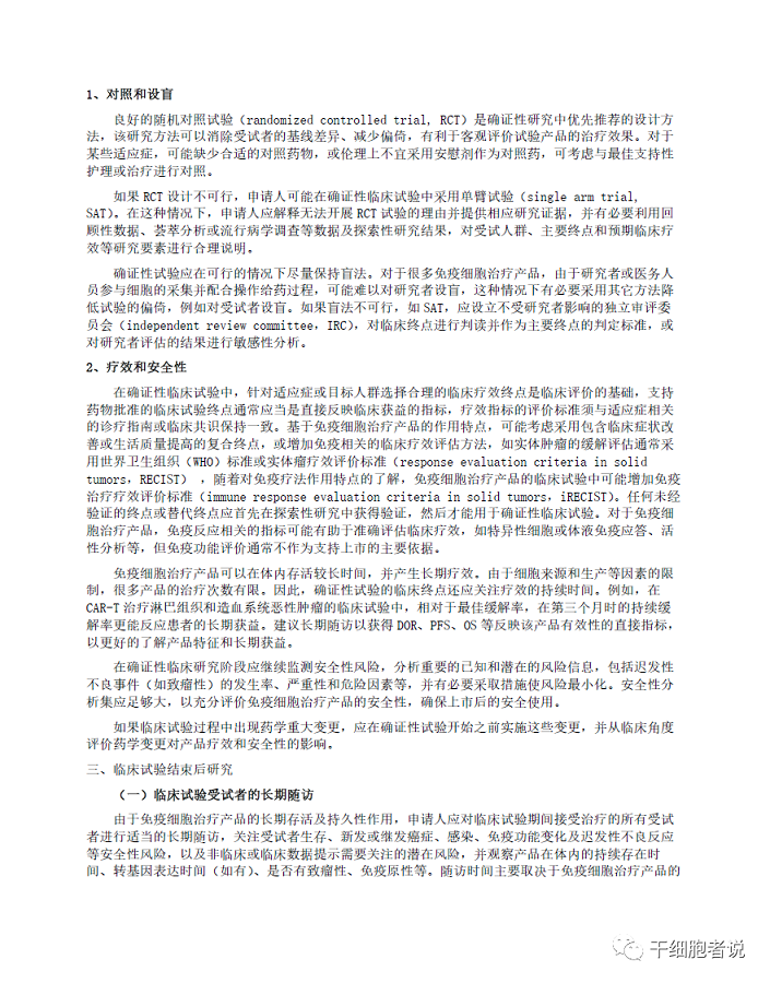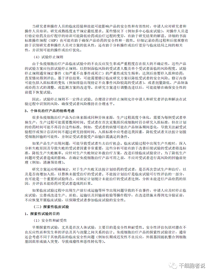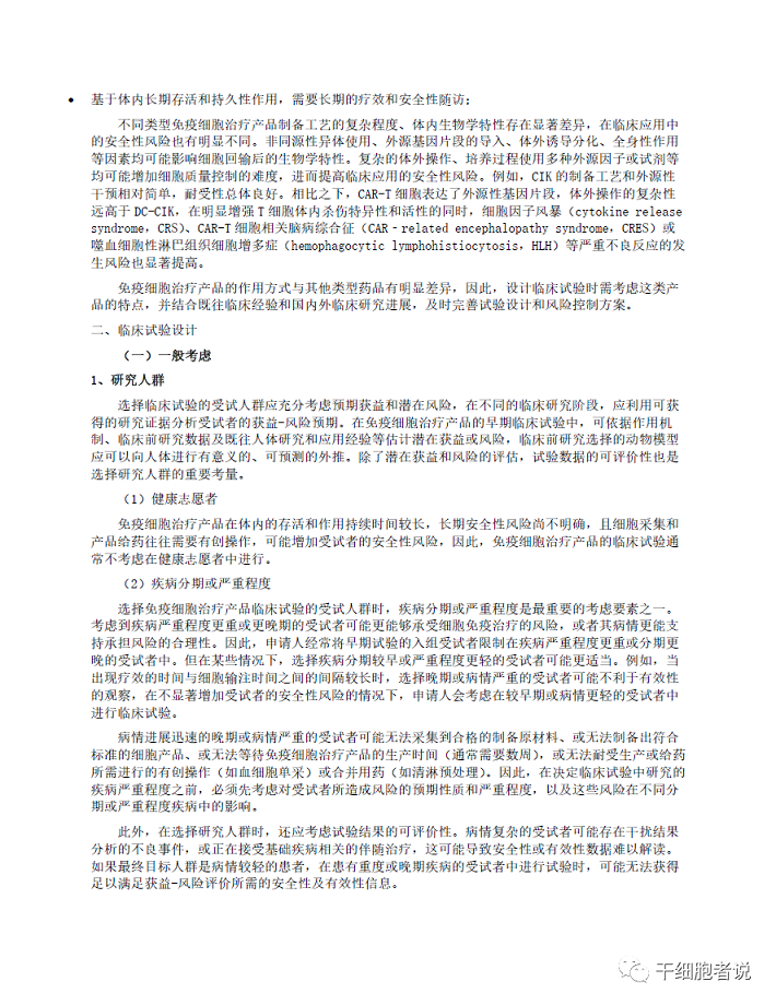 三、主要內(nèi)容與說明本指導(dǎo)原則介紹了免疫細(xì)胞治療產(chǎn)品在開展臨床試驗(yàn)時(shí)的一般考慮及個(gè)體化治療產(chǎn)品的特殊考慮,對(duì)免疫細(xì)胞治療產(chǎn)品開展探索性臨床試驗(yàn)和確證性臨床試驗(yàn)的研究目標(biāo)、研究方法和評(píng)價(jià)方式等進(jìn)行了闡述,并提出免疫細(xì)胞治療產(chǎn)品長期隨訪的相關(guān)要求。本指導(dǎo)原則的內(nèi)容適用于按照藥品管理相關(guān)法規(guī)進(jìn)行研發(fā)和注冊(cè)申報(bào)的細(xì)胞免疫治療產(chǎn)品,旨在為該類產(chǎn)品開展臨床試驗(yàn)的總體規(guī)劃、設(shè)計(jì)、實(shí)施和試驗(yàn)數(shù)據(jù)分析等方面提供必要的技術(shù)指導(dǎo),以減少受試者參加臨床試驗(yàn)的風(fēng)險(xiǎn),并規(guī)范對(duì)細(xì)胞免疫治療產(chǎn)品的安全性和有效性的評(píng)價(jià)方法。部分免疫細(xì)胞治療產(chǎn)品兼具細(xì)胞治療和基因治療產(chǎn)品的特性。本指導(dǎo)原則的目的不是對(duì)其監(jiān)管屬性或分類的認(rèn)定,而是基于現(xiàn)有認(rèn)識(shí),對(duì)細(xì)胞免疫治療產(chǎn)品開展臨床試驗(yàn)時(shí)若干技術(shù)問題的建議和推薦,內(nèi)容不具有強(qiáng)制性,隨著研究和認(rèn)識(shí)的深入,原則內(nèi)容將繼續(xù)修訂和完善。鼓勵(lì)申辦者與藥品審評(píng)中心就試驗(yàn)方案的具體設(shè)計(jì)和細(xì)節(jié)進(jìn)行溝通。