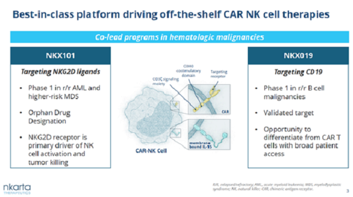 NKX101和NKX019是兩款同種異體的即用型NK細(xì)胞療法。使用從健康供體中獲得的外周血NK細(xì)胞,并利用生物工程添加CAR。NKX101的CAR靶向腫瘤表面的NKG2D配體。NKG2D是NK細(xì)胞的關(guān)鍵性激活受體,其配體在癌癥細(xì)胞中過度表達。NKX019的CAR靶向腫瘤表面的CD19,這是已經(jīng)被臨床驗證的靶點。除了CAR之外,這些候選療法還表達與細(xì)胞膜結(jié)合的IL-15,用于增強細(xì)胞的持久性和活性。
