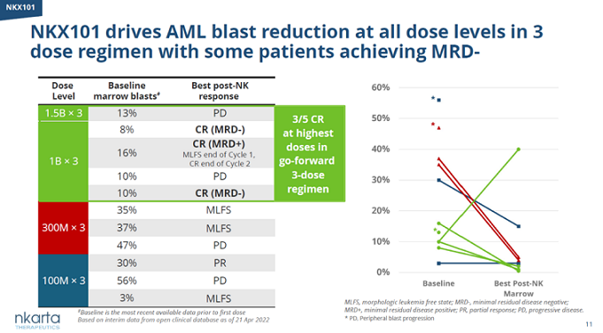 在評估NKX101治療復(fù)發(fā)/難治性急性髓系白血?。ˋML)和骨髓增生異常綜合癥(MDS)的臨床試驗中,接受更高劑量NKX101的3劑治療方案治療的5名AML患者中3名獲得完全緩解,其中兩名患者達到最小殘余病灶(MRD)陰性標(biāo)準(zhǔn)。