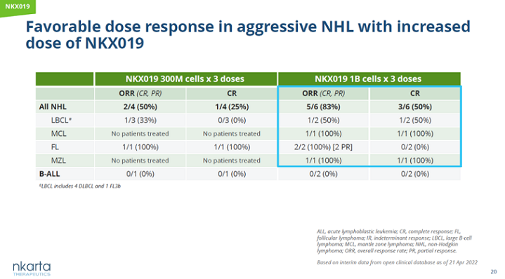 在評估NKX019治療復(fù)發(fā)/難治性B細(xì)胞癌癥的臨床試驗中,接受更高劑量NKX019的3劑給藥方案治療的6名患者中3名患者達到完全緩解,其中包括一名彌漫性大B細(xì)胞淋巴瘤患者和一名套細(xì)胞瘤患者。