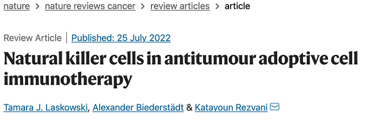 2022年7月25日,美國得克薩斯大學安德森癌癥中心的Katayoun Rezvani教授在國際知名期刊《nature reviews cancer》上發(fā)表了題為“Natural killer cells in antitumour adoptive cell immunotherapy” 的報道。該綜述描述了增強NK細胞細胞毒性和壽命的各種方法,評估了免疫治療的挑戰(zhàn)和機遇;并從臨床中吸取經驗教訓,思考了將如何指導下一代NK細胞產品的設計,以解決每種癌癥的獨特復雜性。
