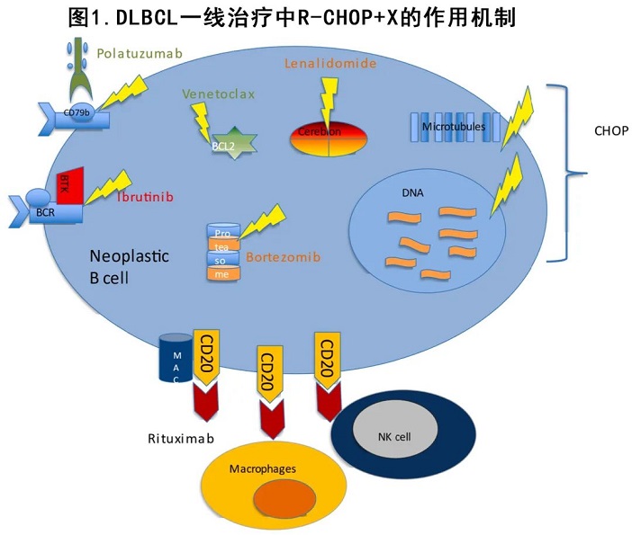 另一個不同且有吸引力的策略是在標準R-CHOP中加入新型生物藥物 (‘X’),無論是在誘導期還是作為維持期 (圖1)。