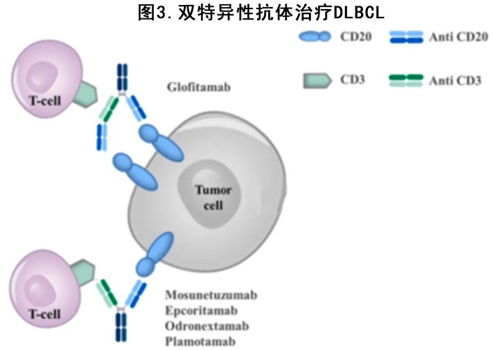 雙特異性抗體 (BsAb) 是識別兩種特異性抗原或表位的單抗,可使自體 T 細胞重定向對抗腫瘤細胞(圖3)。最近已有多個不同抗 CD20 BsAbs 在R/R DLBCL 進行了研究,結果顯示即使在多難治性患者中也具有良好的活性,并且安全性可控,表現為CRS和神經毒性事件的發(fā)生率較低,多為1-2級。