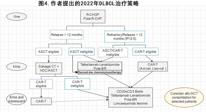 鑒于目前新的生物制劑和創(chuàng)新組合的動態(tài)格局,作者將2022年治療 DLBCL 的可能策略總結于圖4,但是正如一首著名歌曲所說“這是一個變革的時代”( “the times they are a-changing”),這一策略可能需要在不久的將來隨著正在進行的研究發(fā)表結果而進行更新。