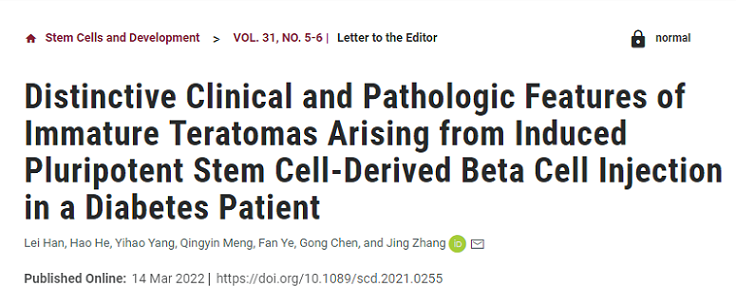 參考資料:Han L, He H, Yang Y, Meng Q, Ye F, Chen G, Zhang J. Distinctive Clinical and Pathologic Features of Immature Teratomas Arising from Induced Pluripotent Stem Cell-Derived Beta Cell Injection in a Diabetes Patient. Stem Cells Dev. 2022 Mar;31(5-6):97-101. doi: 10.1089/scd.2021.0255. Epub 2022 Feb 4. PMID: 35018826.(以上內(nèi)容僅供學術(shù)探討)