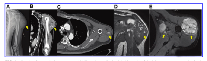 接受iPS細胞治療患者的畸胎瘤。(A) 在左上臂的三角肌中,觀察到一個圓形的混合密度腫塊,邊界不清,為9.6±5.2cm。(B) CT冠狀掃描顯示三角肌內(nèi)有一圓形混合密度腫塊,邊界不清。(C)增強CT軸向掃描顯示不均勻和中度強化。(D)MRI T1W以等信號為主,有不規(guī)則的高低信號區(qū)。(E) T2W也顯示高信號和斑片狀低信號區(qū),左腋窩有多個淋巴結(jié)腫大。